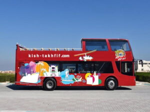 اتوبوس هاپ آن، هاپ آف، یک اتوبوس دو طبقه روباز است که به شما امکان می دهد تا گشتی در جزیره بزنید و به بازدید جاذبههای گردشگری بپردازید. فعالیت اتوبوسها به این صورت است که با خرید بلیط می توانید در مدت اعتبار آن، هر تعداد دفعهای که خواستید، سوار اتوبوس شوید و از آن استفاده کنید. ساعت کار این اتوبوسها از ساعت ۹ صبح تا ۱۰ شب است. ایستگاههای اتوبوس هاپ آن، هاپ آف در بخشهای مختلف شهر از جمله اسکله تفریحی، بازار دامون، شهر زیرزمینی کاریز، شهر تاریخی حریره، اسکله میرمهنا، کشتی یونانی، ساحل مارینا، ساحل مرجان و… قرار گرفته اند و در نتیجه بهراحتی میتوانید جاذبههای متعددی را ببینید.