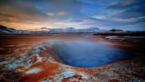 - منطقه زمینگرمایی ناماسکار (Námaskarð): اینجا زمین نفس میکشد. حوضچههای گِل جوشان، زمینهای رنگارنگ (به خاطر گوگرد و مواد معدنی دیگر) و ستونهای بخار که با صدای هیس از زمین خارج میشوند، منظرهای جهنمی و در عین حال شگفتانگیز ایجاد میکنند. بوی شدید گوگرد در هوا میپیچد و به شما یادآوری میکند که روی پوسته نازکی از یک سیاره زنده ایستادهاید.
