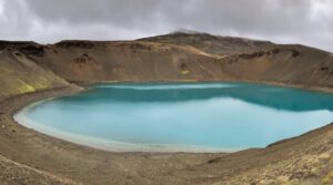 - آتشفشان کرافلا (Krafla) و دهانه ویتی (Víti): میتوانید تا لبه دهانه یک آتشفشان رانندگی کنید و به دریاچه آبیرنگ داخل آن خیره شوید. اطراف منطقه پر از گدازههای سیاه و خشکشده است که نشان از فورانهای اخیر دارد.