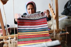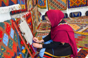 بافت قالی و قالیچه در تمامی نقاط ایران رایج می باشد، بافت قالی و قالیچه در میان ایل نشینان و روستاییان بیشتر رواج دارد، قالی و قالیچه جزو وسایل ضروری زندگی ایل نشینان و جزء اصلی جهیزیه دختران می باشد، همچنین در خانه همه این هنر زیبا دیده می شود که امروزه بخاطر وجود دستگاه های ماشینی قالی های ماشینی در طرح و رنگ های مختلف بیشتر وجود دارد، اما هستند کسانی که به این هنر علاقه مند هستند، و از این همر دست بافت ارزشمند حمایت می کنند. اجزای تشکیل دهنده قالی عبارتند از: پود ، تار ، پرز یا خواب قالی، در این استان جنس تارها از پنبه یا مخلوط پشم و مو است و جنس پودها از پشم یا پنبه می باشد .اما جنس پرز از پشم است و گاهی از کامواهای رنگی واکریلیک نیز استفاده می شود. دستگاههای بافندگی قالی و قالیچه توسط خود بافندگان ساخته می شود و به شکل افقی است.
